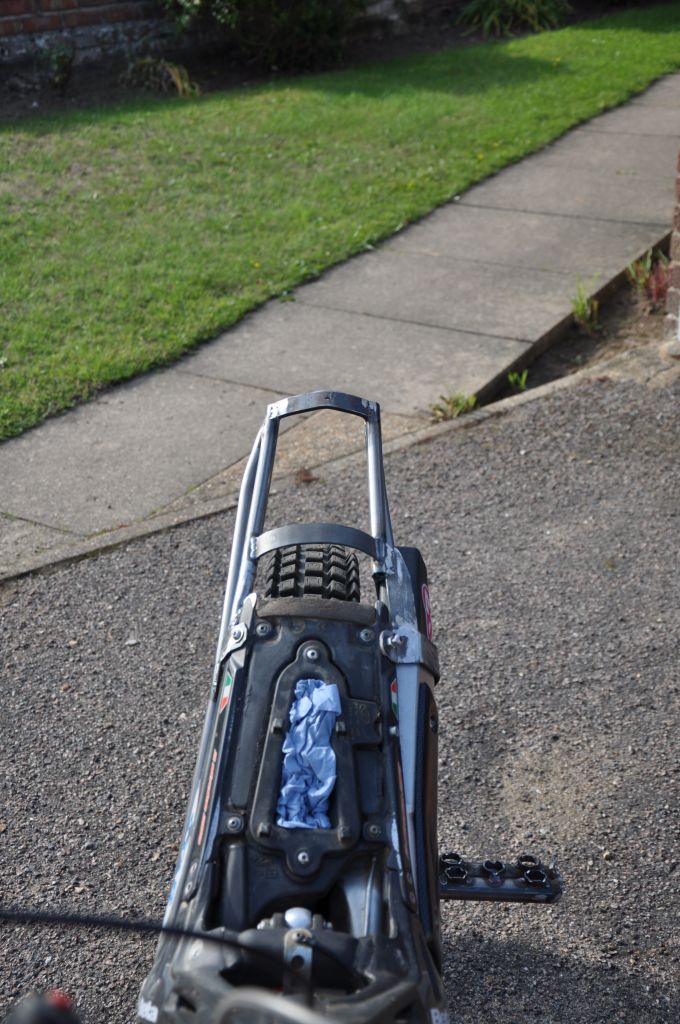The rear sub-frame is off-set slightly to the right, to allow the passenger to get as far over to the right when needed and also have a hand hold that is clear of the rear tire.